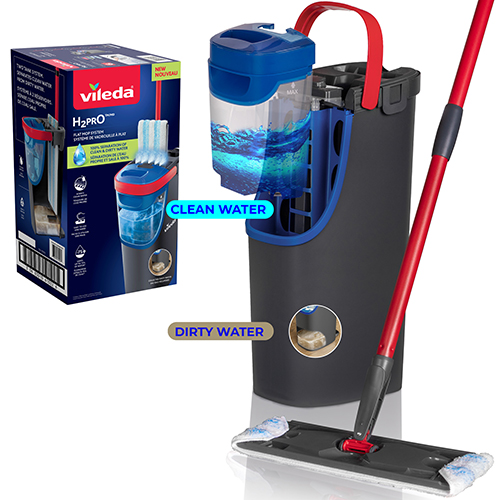 je opatrený inovatívnym dvojkomorovým systémom vedier, ktorý udržuje čistú a špinavú vodu 100% oddelene. Tým je zaistené, že vždy vytierate čerstvou čistou vodou, čo zaisťuje efektívnejšie a hygienickejšie čistenie vašich podláh. Žmýkanie je uskutočňované bez použitia rúk a ohýbania, prostredníctvom pedálu umožňujúceho ľahké žmýkanie, čo uľahčuje a zefektívňuje vaše vytieranie. Hlava trojuholníkového mopu sa ľahko dostane do úzkych rohov, pod nábytok a pozdĺž podlahových líšt. S minimálnom úsilím tak môžete dosiahnuť dôkladné vyčistenie v každom kúte. Vileda H2Pro strapcový rotačný mop je vhodný pre všetky typy tvrdých podláh. Náhradu možno prať v práčke. Výrobca predĺžil záruku na 5 rokov. Cena výrobku je 61,90 Eur.